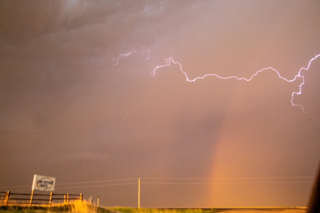 Continuing to target the cluster over northwest Kansas, which had remained almost stationary, we approached the town of Oberlin, Kansas to position ourselves to the southwest of the storm and get a clear view of the storm structure. We pulled off to a side road that was several miles to the South of the town and upon observation, we noticed two areas of rotation within the clouds: a cyclonic and anticyclonic rotation. This was interesting, as a thunderstorm will usually have rotation only in one direction. We also saw active lightning within this cluster, and a double rainbow from the sun beginning to set to the West. Fortunately, I was able to snap a picture of the double rainbow and some cloud-to-cloud lightning together before we needed to start moving south, as this cluster was beginning to slowly shift towards us.