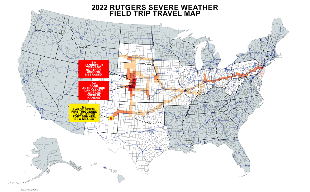 Our trip had the most storm days and the fewest busts in the history of this trip being offered at Rutgers. We also saw the most tornadoes, including possible tornadoes and SPC confirmed tornadoes. One of these tornadoes was the rare anticyclonic tornado in Oberlin, Kansas, making for the first anticyclonic tornado ever seen in trip history. We also had the fewest ‘Marginal’ risk (Level 1/5) chase days, the first wildfire, and the latest hotel check-in time in trip history.
