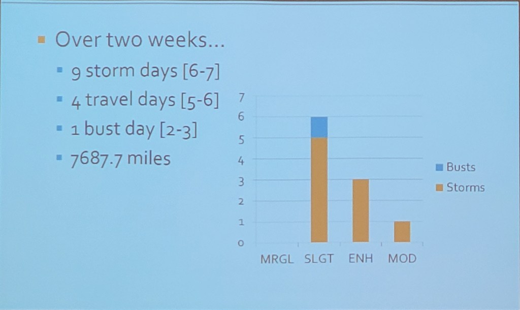 During our trip, we had 9 active storm days, which was above the trip historical average of 6-7 active storm days, highlighting the heightened activity during the trip. We also had 4 travel days (days just meant for traveling), which was below the trip historical average of 5-6 travel days, and only 1 bust day (a day where severe weather did not materialize as planned).