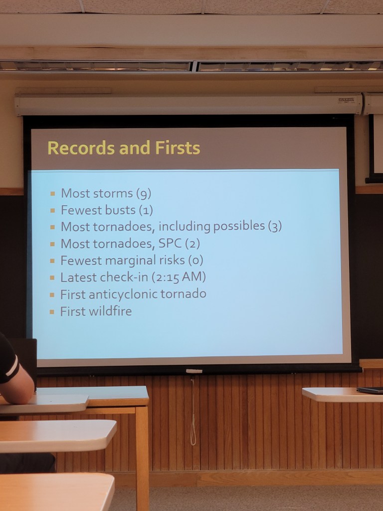 One final day for this class: presentation day! Our forecasting team decided to present on our team’s first forecast day, during which we saw the rare anticyclonic tornado in Oberlin, Kansas. The other forecasting teams also each selected a day to present on, while Dr. Decker gave an overview of the rest of the trip.